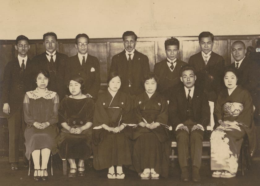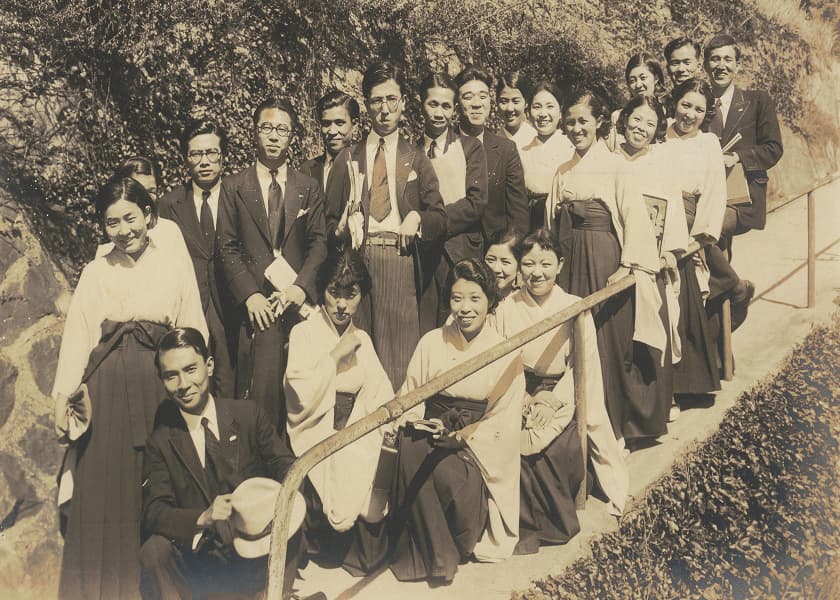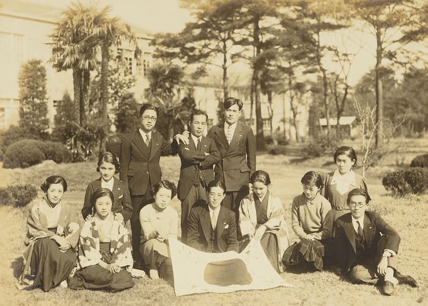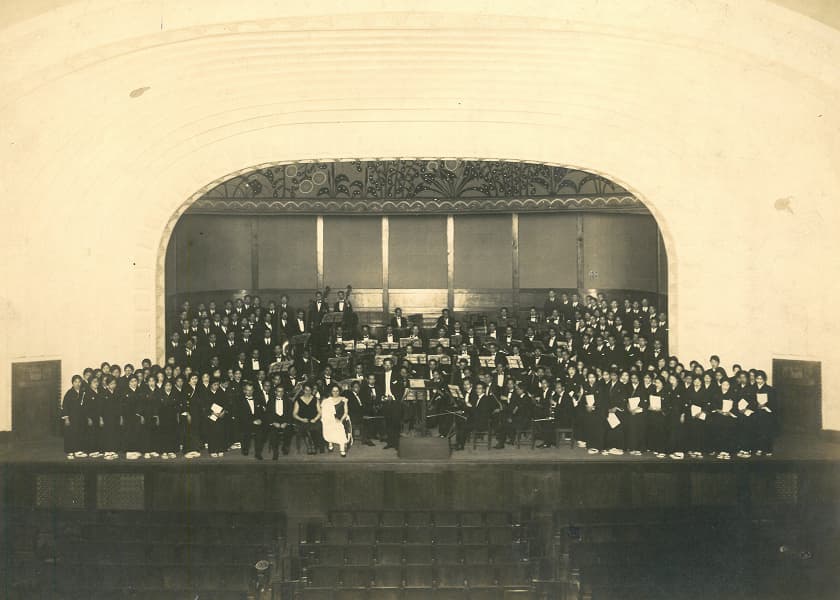 卒業生と共に写る創立者たち(1928年3月・前列右 武岡鶴代、後列一番左 中館耕蔵、左から4人目 渡邊敢、5人目 榊原直、6人目 矢田部勁吉) 1926(大正15)年1月、国立音楽大学の前身「東京高等音楽学院」の創立が帝国ホテルで発表されました。私立の音楽専門学校でしたが、1887年設立の官立「東京音楽学校」(現:東京藝術大学音楽学部)に並ぶ音楽学校設立構想でした。