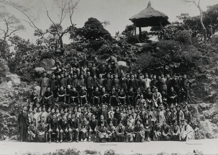 第1回入学生(仮校舎のあった新宿園にて) 創立時の想いは、その後「自由、自主、自律」という基本理念に集約され、現在に至っています。
