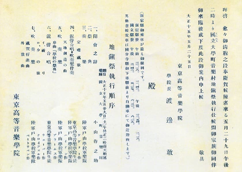 同年4月には、四谷の遊園地「新宿園」にあった建物を仮校舎として初の授業を開始します。教員は23名、入学者は本科27名(声楽部・器楽部、5年後には作曲部が加わる)、予科74名、高等師範科19名、師範科12名でのスタートでした。