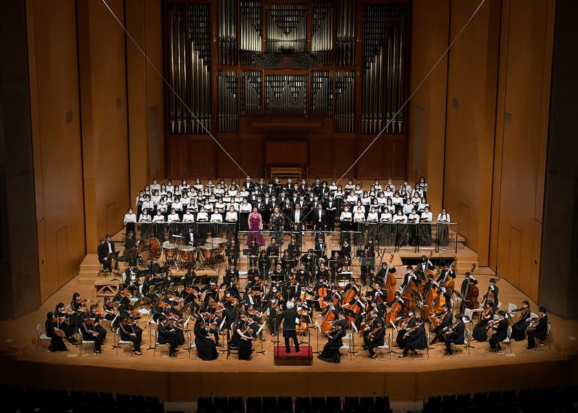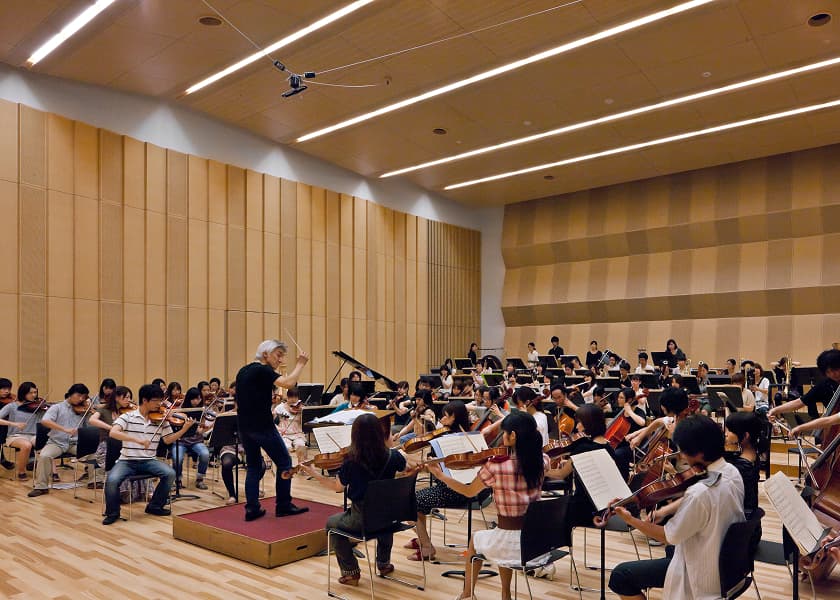 新1号館 オーケストラスタジオ 音楽大学の中枢ともいえるレッスン室、スタジオ等を擁する建物の大規模な建設計画から約20年後の2011(平成23)年、新1号館が竣工します。オペラ、合唱、オーケストラの各スタジオ、打楽器演習室、電子オルガン演習室を含む12のアンサンブル室、108のレッスン室を備え、学生はこの優れた音響空間と音楽環境の中で、自由に、そして自主、自律の精神をもって成長していきます。