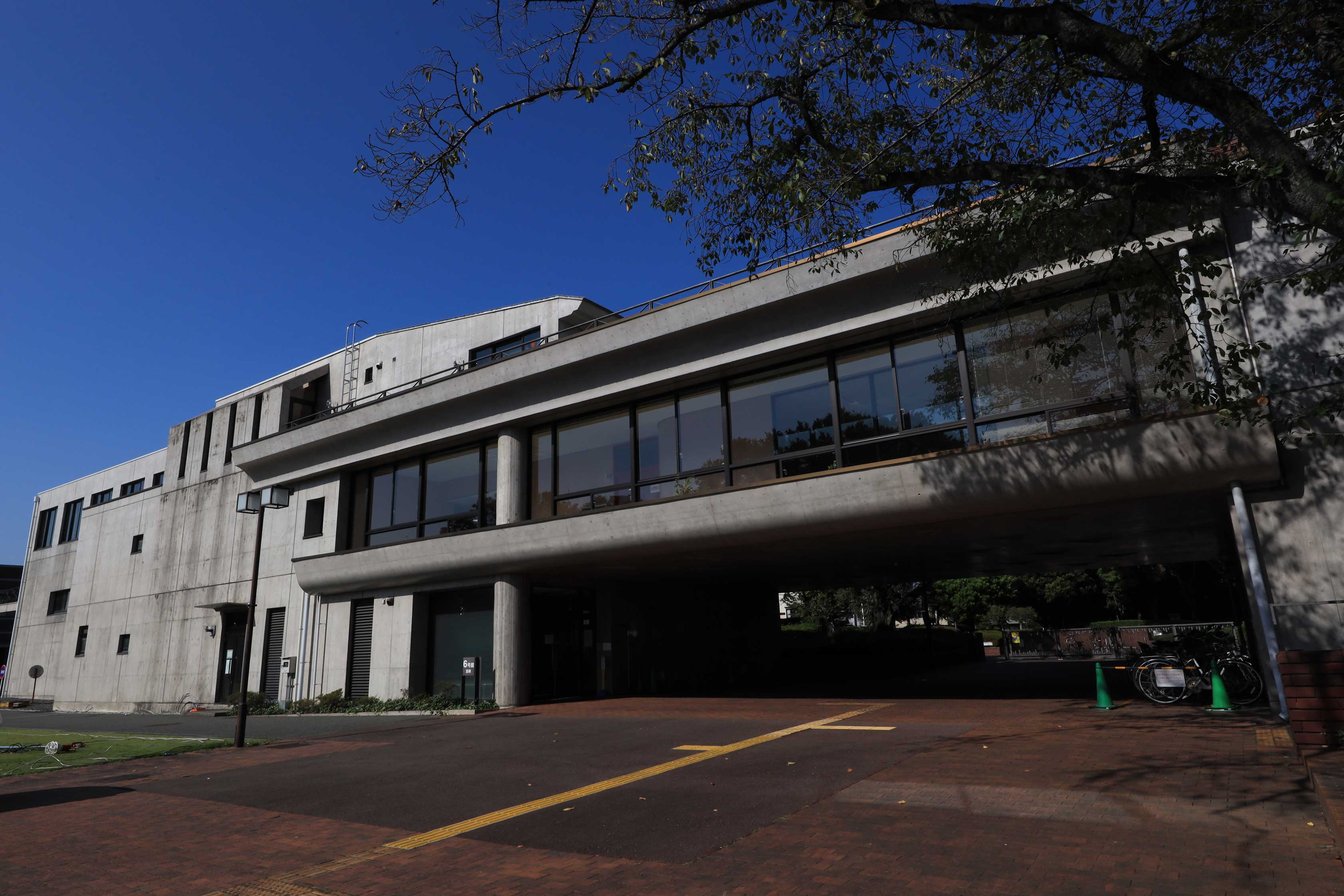 西棟の外観は、前回ご紹介した、打ち込みタイルの外観をもつ東棟とは対照的に、打ち放しコンクリートの外観をもっています。