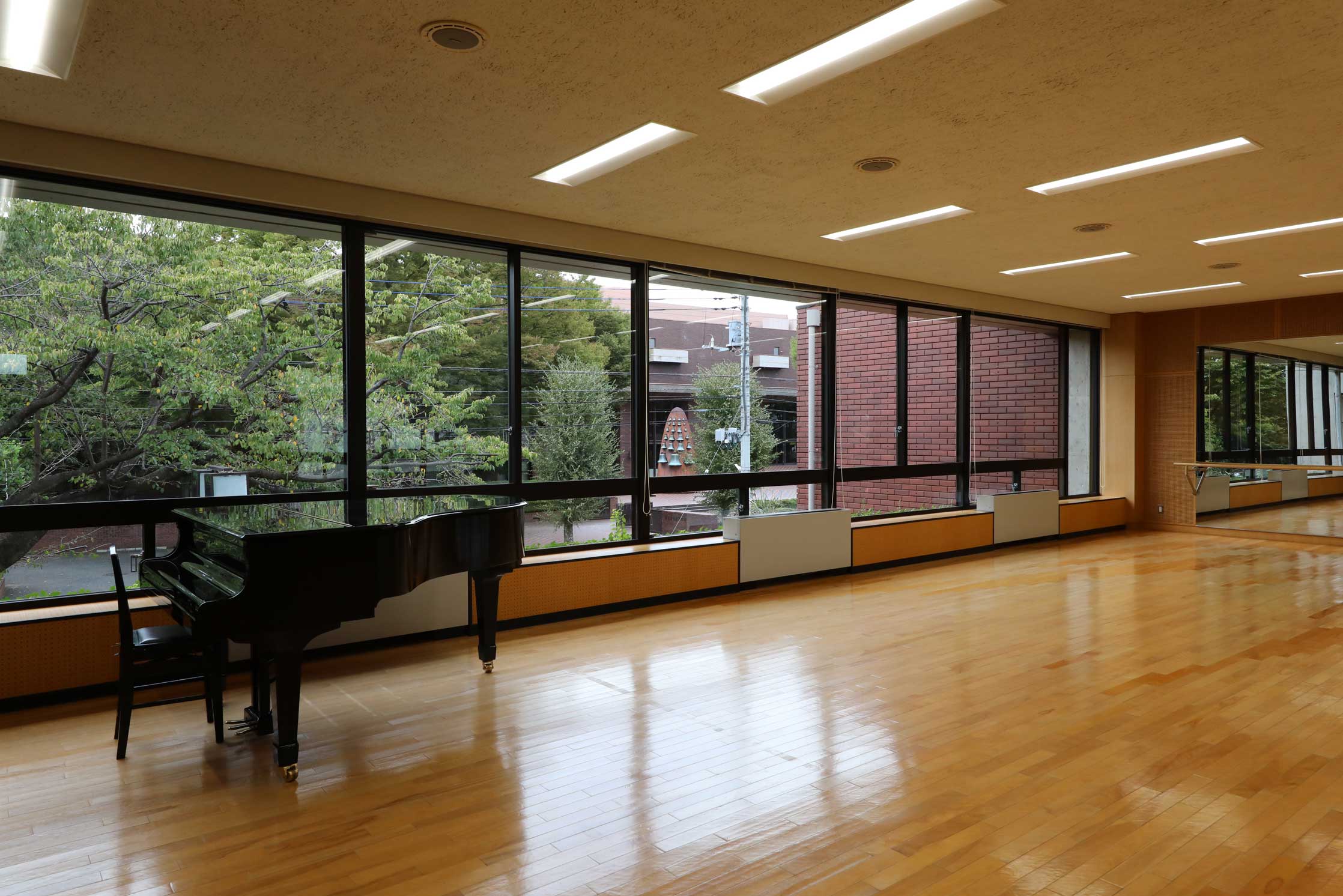 上階のリトミックルームは、バレエスタジオのような鏡張りを備えており、毎日のように授業で活用されています。