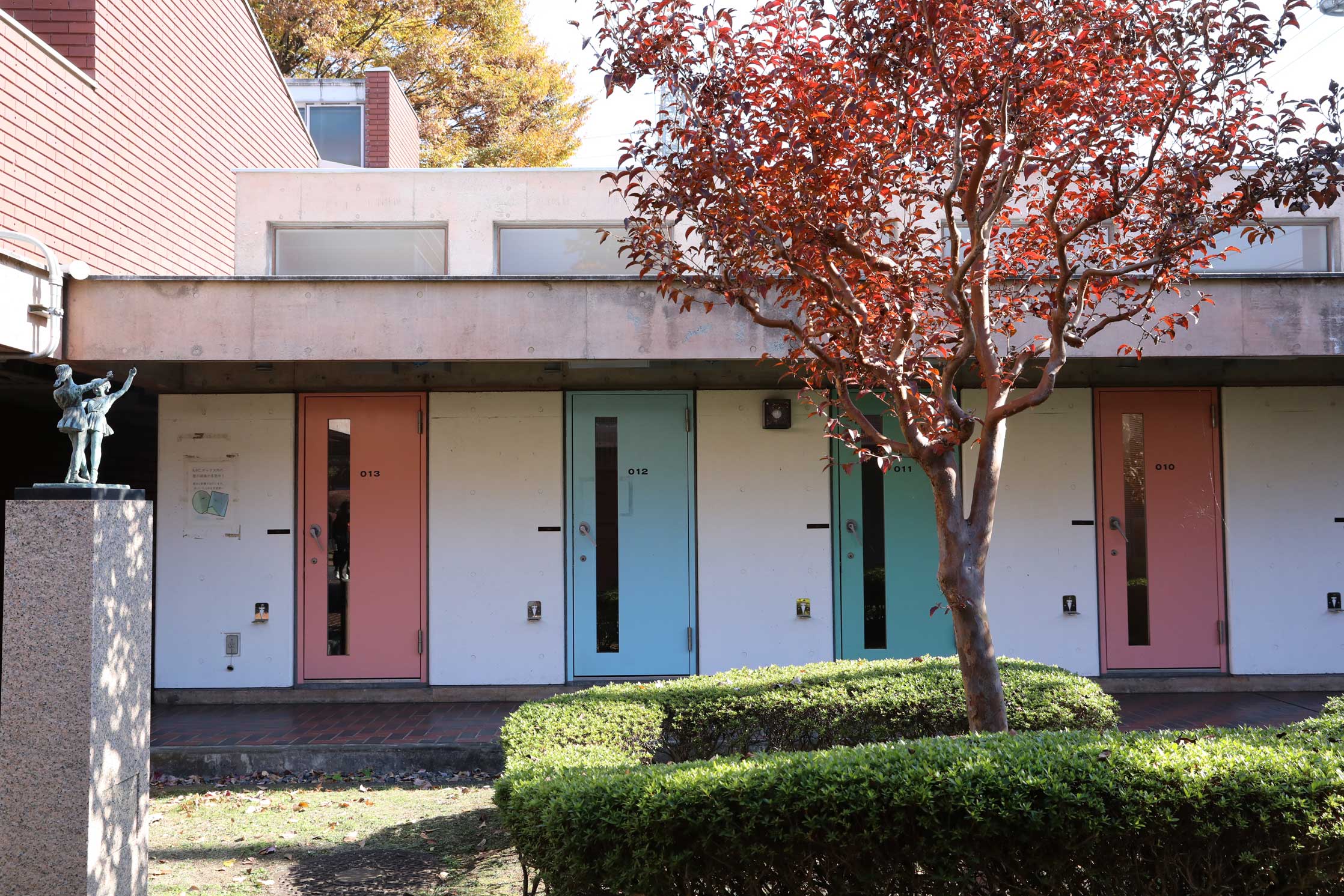 個室練習室は中庭を囲むようなコの字型に配置されており、各扉には赤・青・緑・白色の配色がされています。
