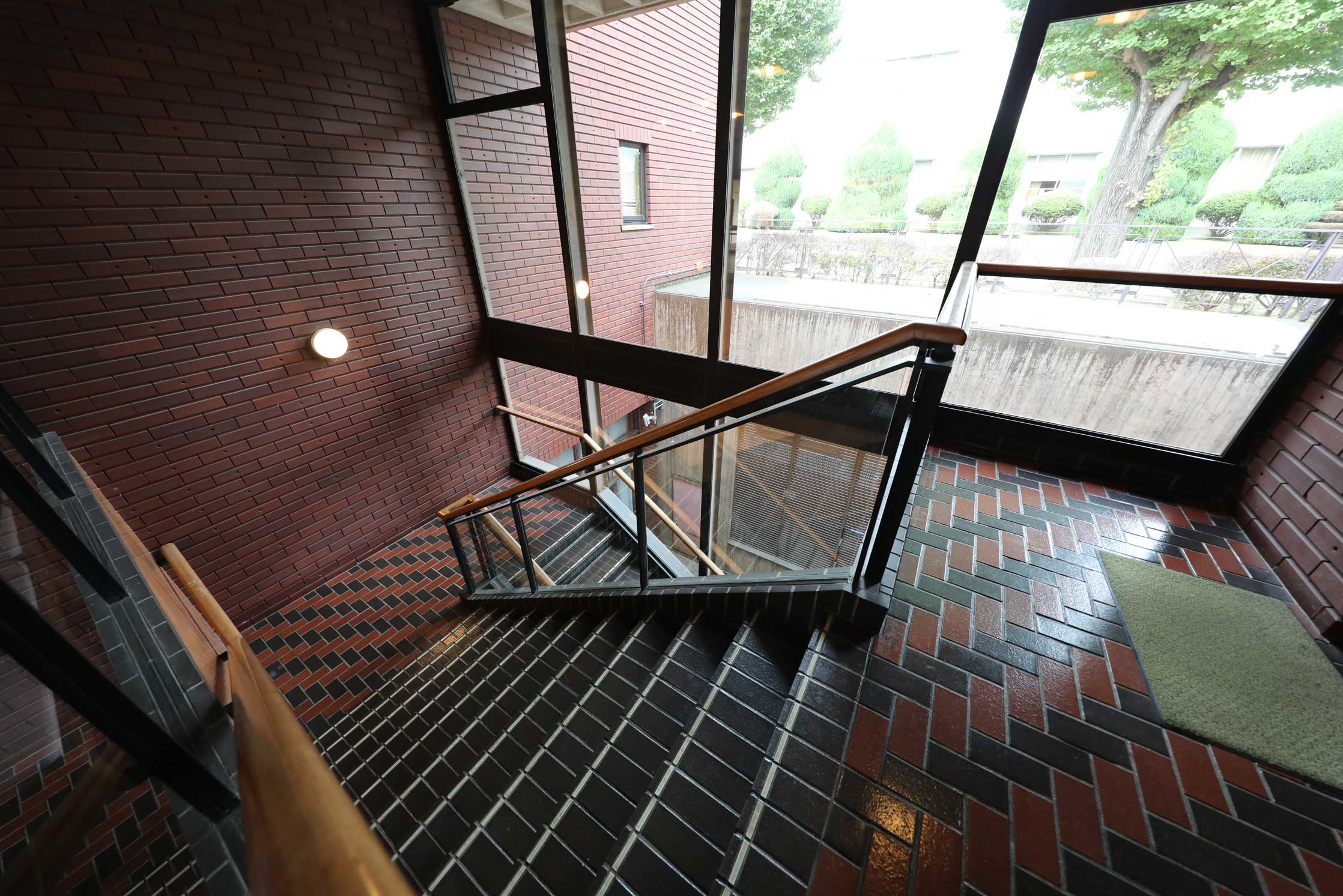 S.P.C.の外観からすでに、打ち込みタイルをはじめ丸い柱や四角い凹凸のある天井など、前川建築らしい特徴を見ることができますが、(個人的に)S.P.C.の前川建築らしさを最も感じる場所は階段の景色です。