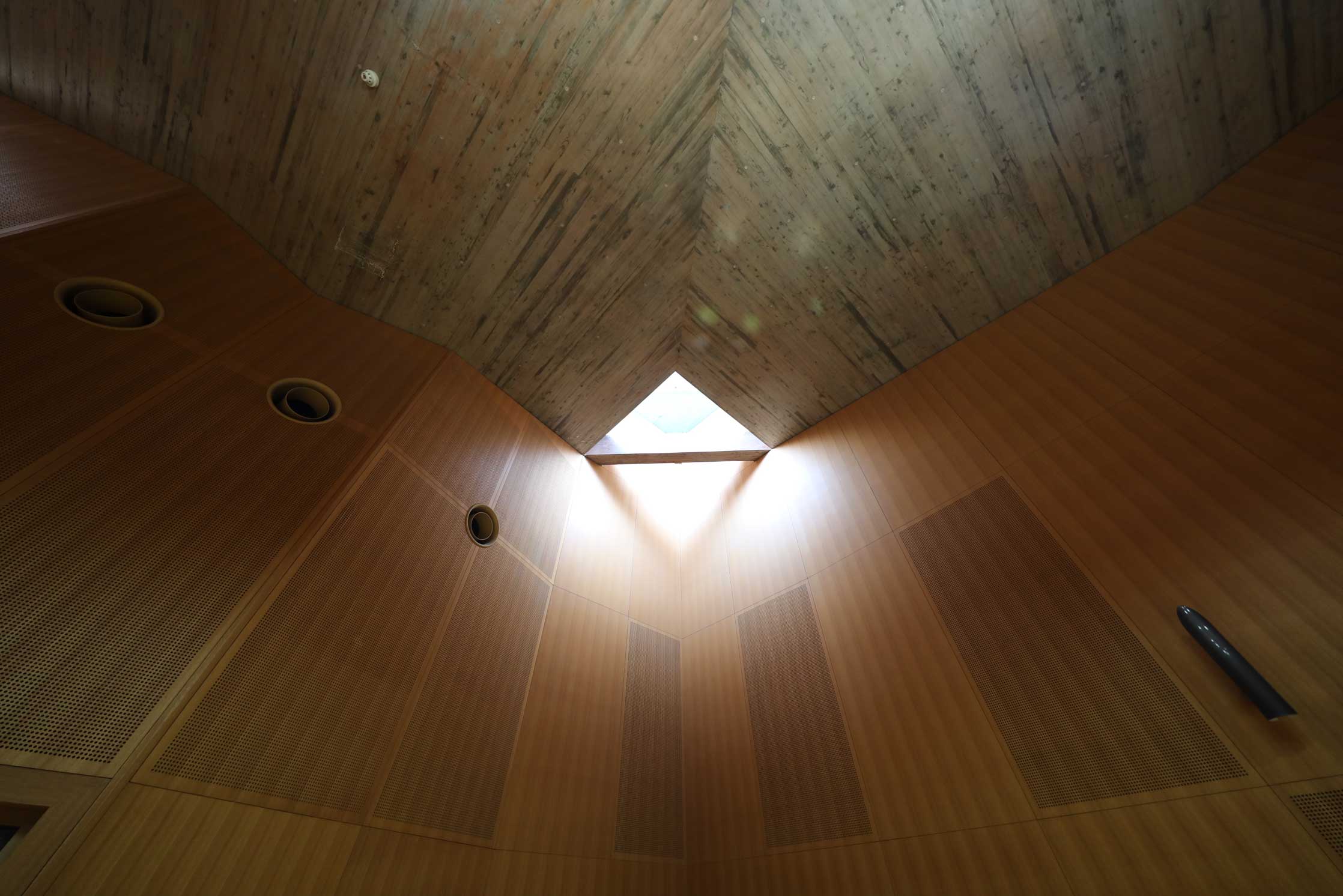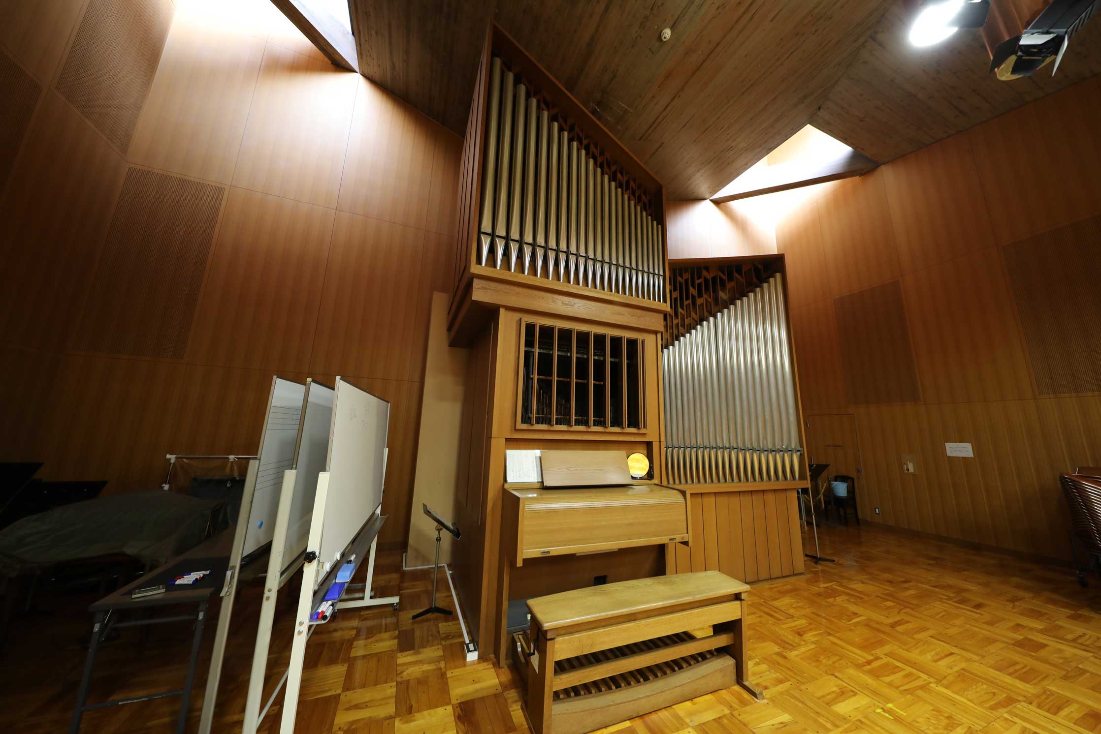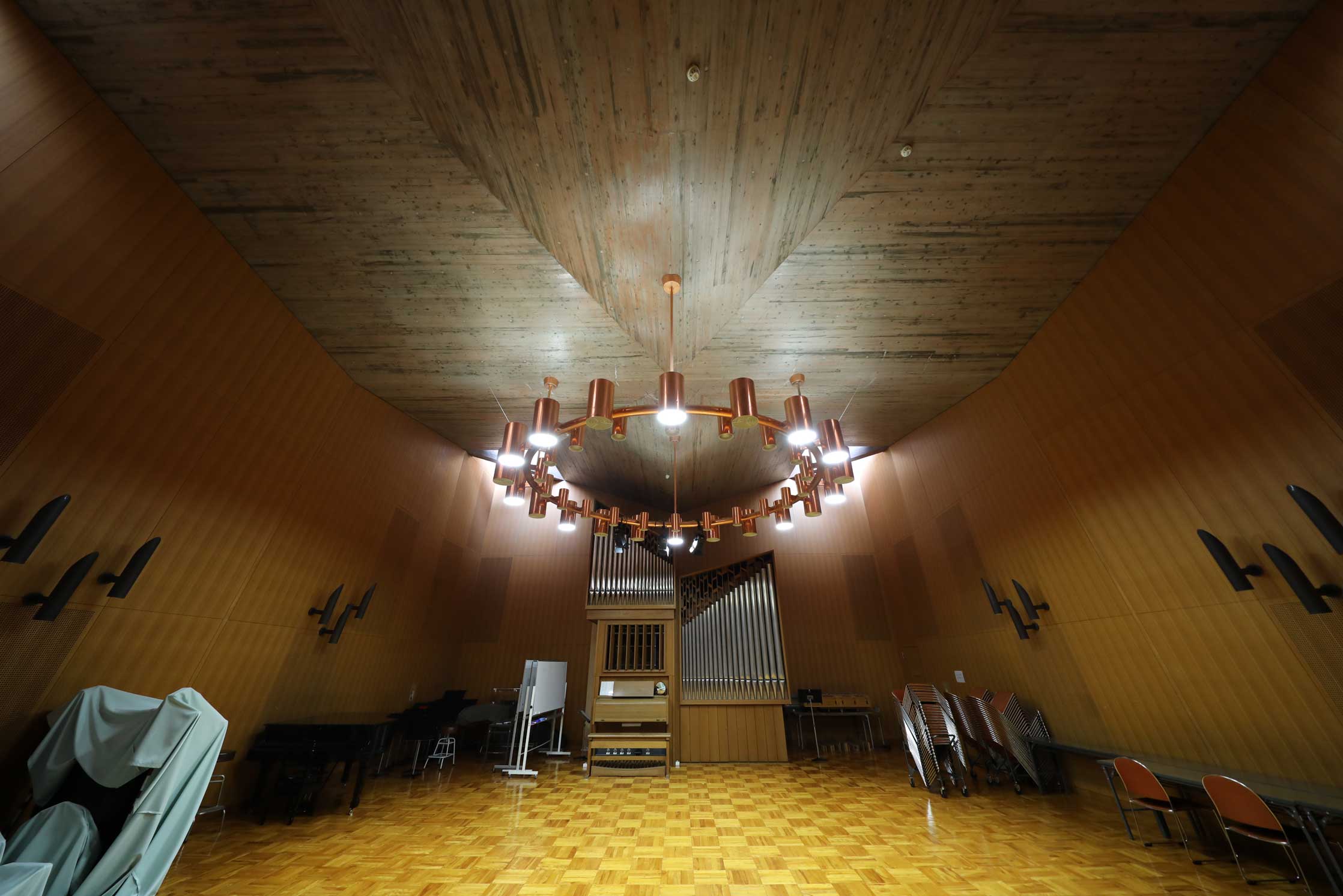 中でもパイプオルガンが設置されたアンサンブル室Aは、コンクリートの天井、ブロンズの輪型の照明、竹筒型の照明など、特に前川的特徴を多く見ることができます。