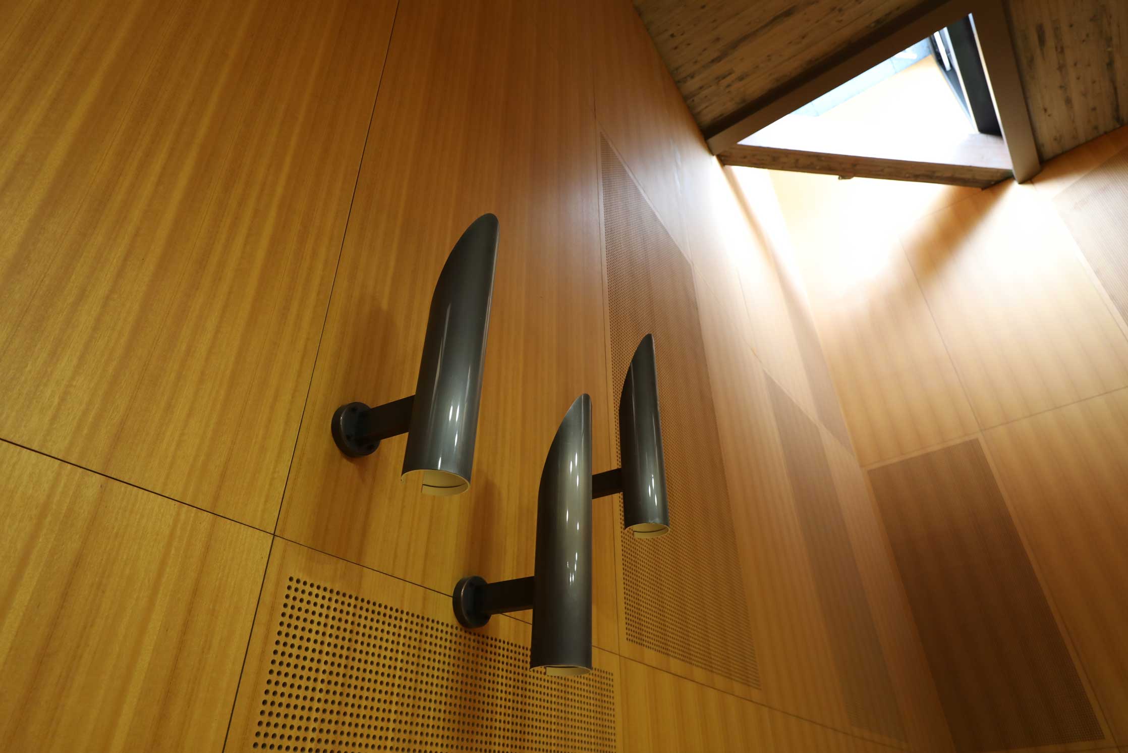 他の前川建築の音楽ホールなどでも見ることができる、特徴的な照明の一つです。