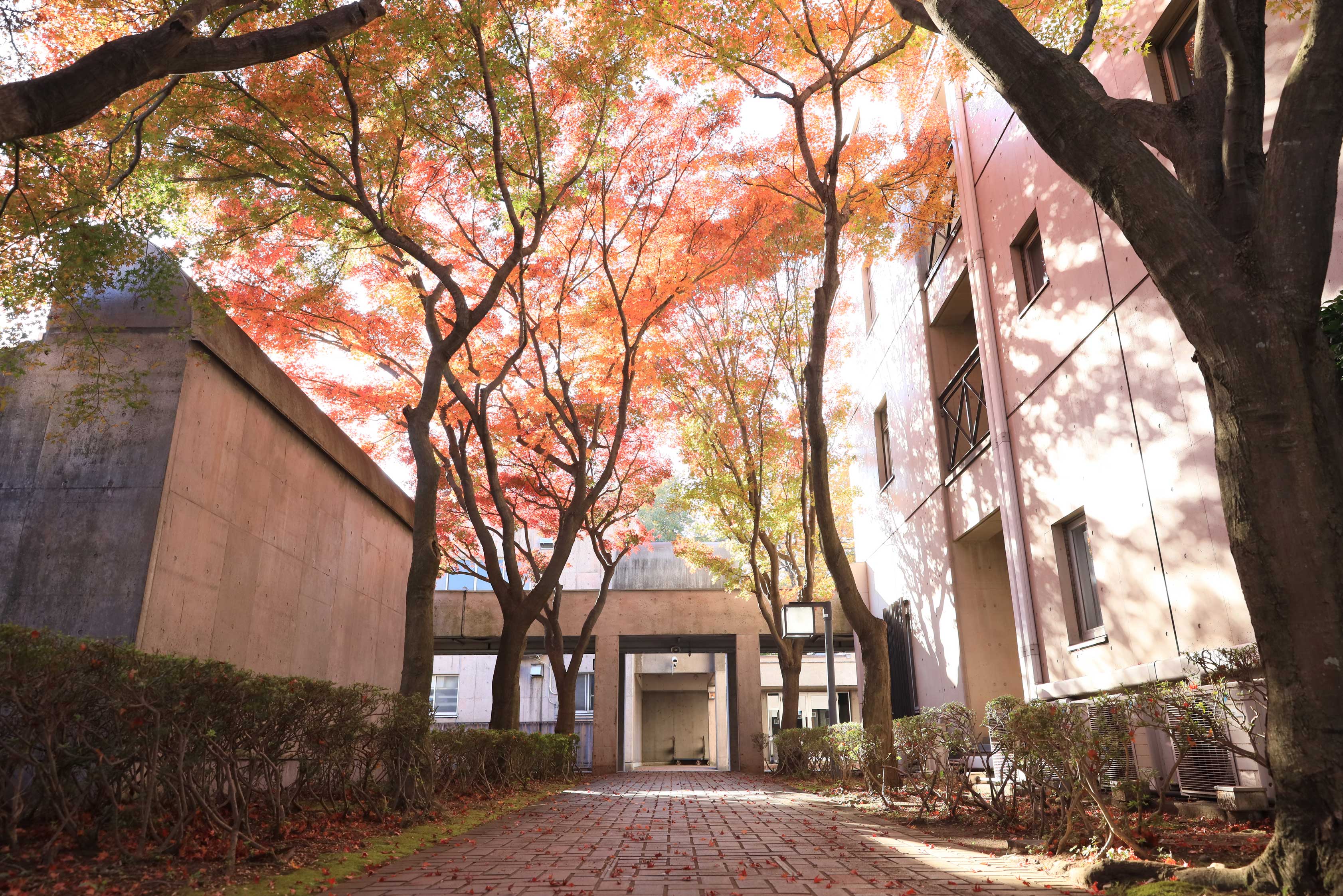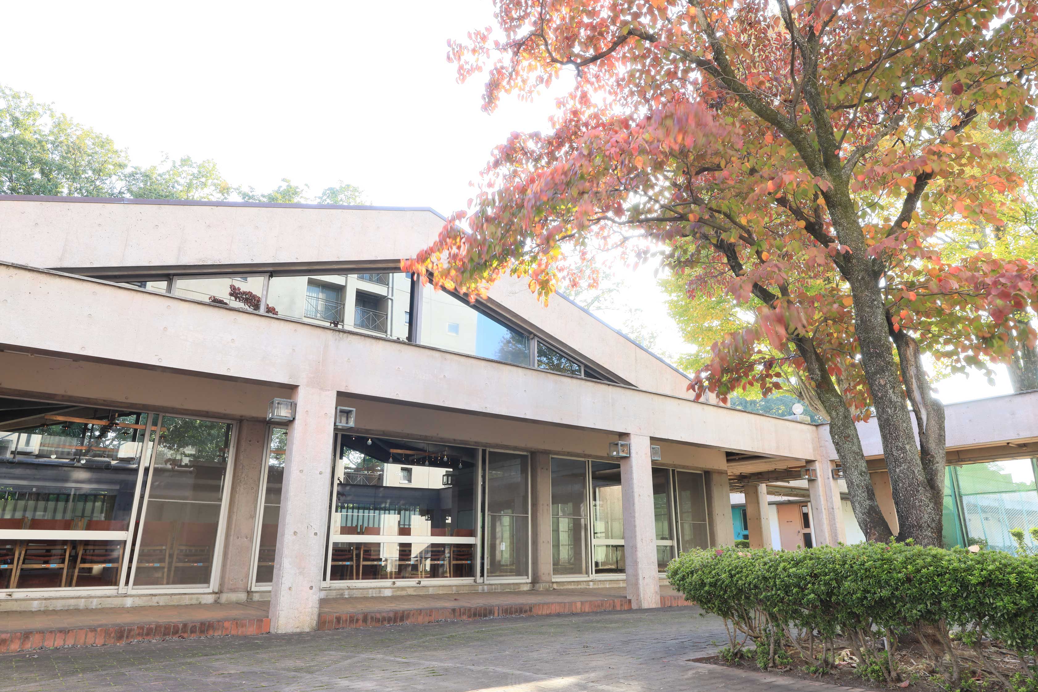 紅葉のアプローチを通り抜けると、ハナミズキの木が植えられた中庭に出て、その中庭を挟むように寮と食堂が向かい合っています。