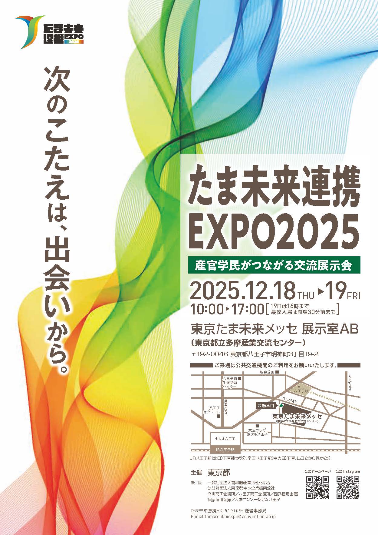 たま未来連携EXPOとは、多摩及び近隣地域の様々な学術機関や地方自治体、産業支援機関等の41団体が参加し、研究成果や社会連携、実践的な取組みを発見できる展示会です。