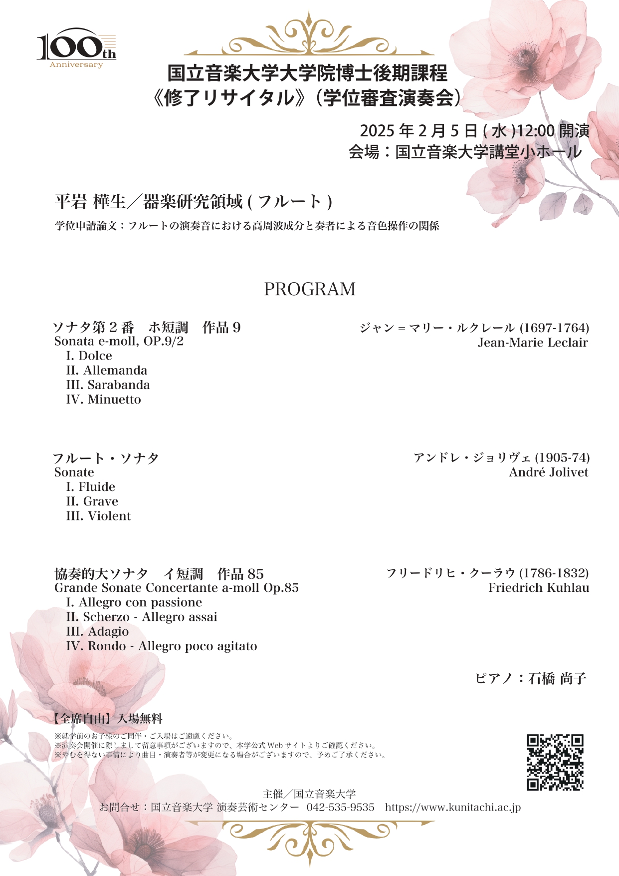 2024年度博士後期課程《修了リサイタル》(学位審査演奏会)器楽研究領域(フルート)