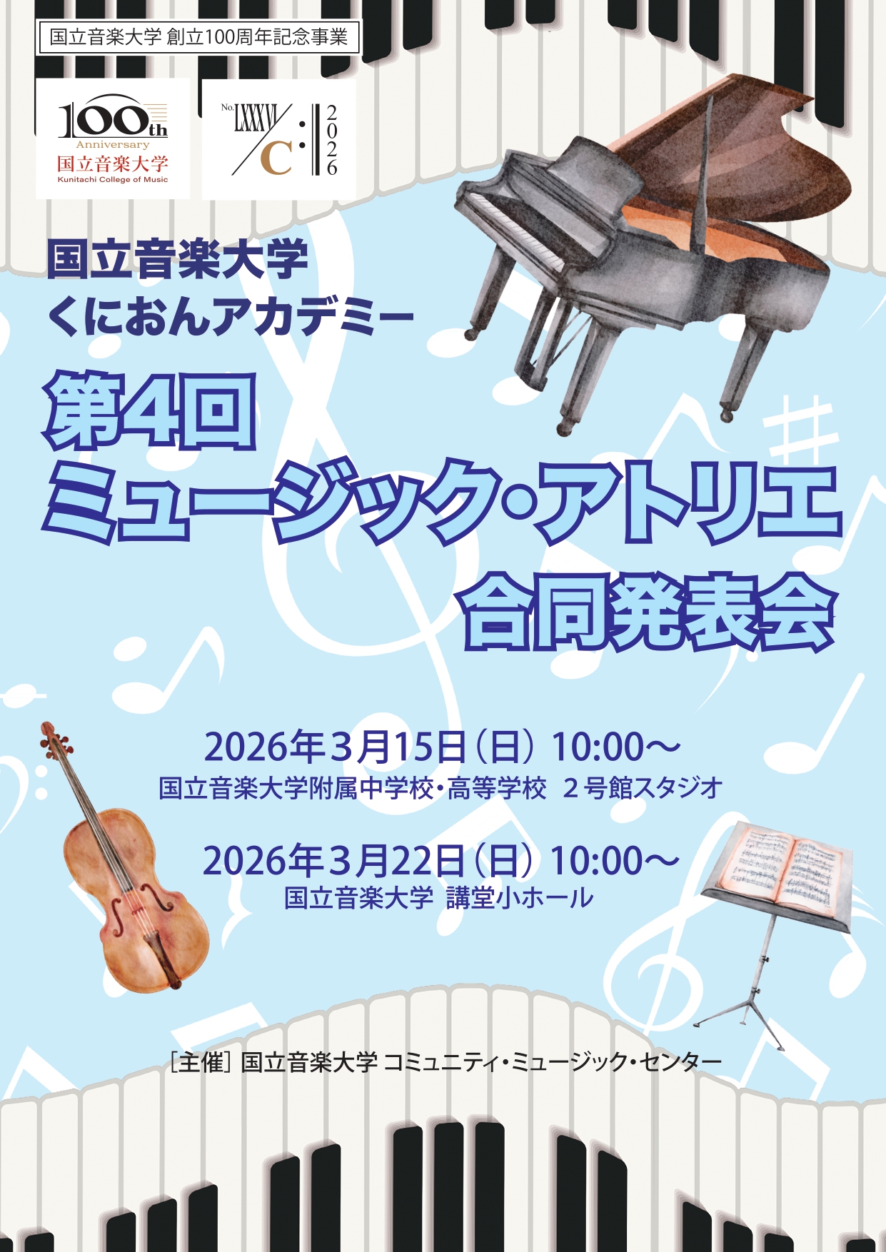 くにおんアカデミー 幼児から高校生を対象に「ジュニア ミュージック・アトリエ」、大人の方を対象に「おとなのためのミュージック・アトリエ」を開講しています。ひとりひとりに寄り添った内容でレッスンや各種講座を行います。 ジュニア ミュージック・アトリエ ジュニア ミュージック・アトリエ お申し込みはこちら おとなのためのミュージック・アトリエ おとなのためのミュージック・アトリエ くにおんアカデミー ミュージック・アトリエ合同発表会 今年度も合同発表会を開催いたします。①2026年3月15日(日) 10:00〜国立音楽大学附属中学校・高等学校 2号館スタジオ②2026年3月22日(日) 10:00〜国立音楽大学 講堂小ホール ■各教室のミュージック・アトリエ受講生が対象です。■どちらか1日のみご参加いただけます。■参加申込み方法などの詳細は11月を目途に各教室よりご案内いたします。