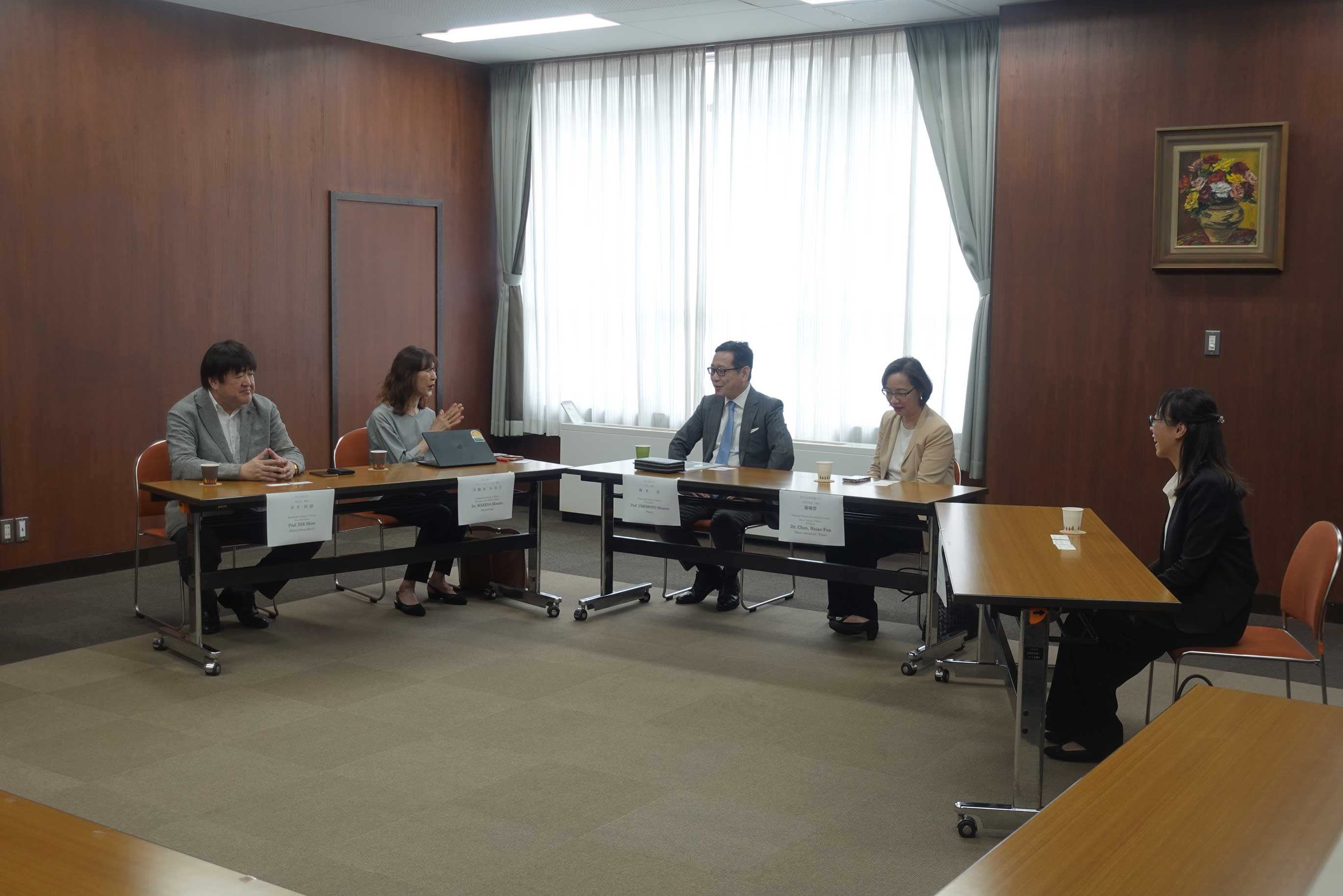 初日となる7月7日には、学長の梅本実先生、副学長の井手詩朗先生、そしてグローバルセンター長の早稲田みな子先生を交えた懇談会を実施しました。台湾師範大学側からは音楽学部長を含む計7名が出席され、今後の交流のあり方について活発な意見交換がなされました。