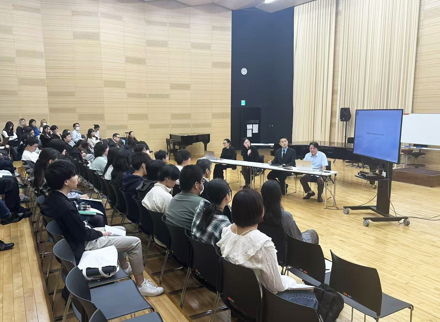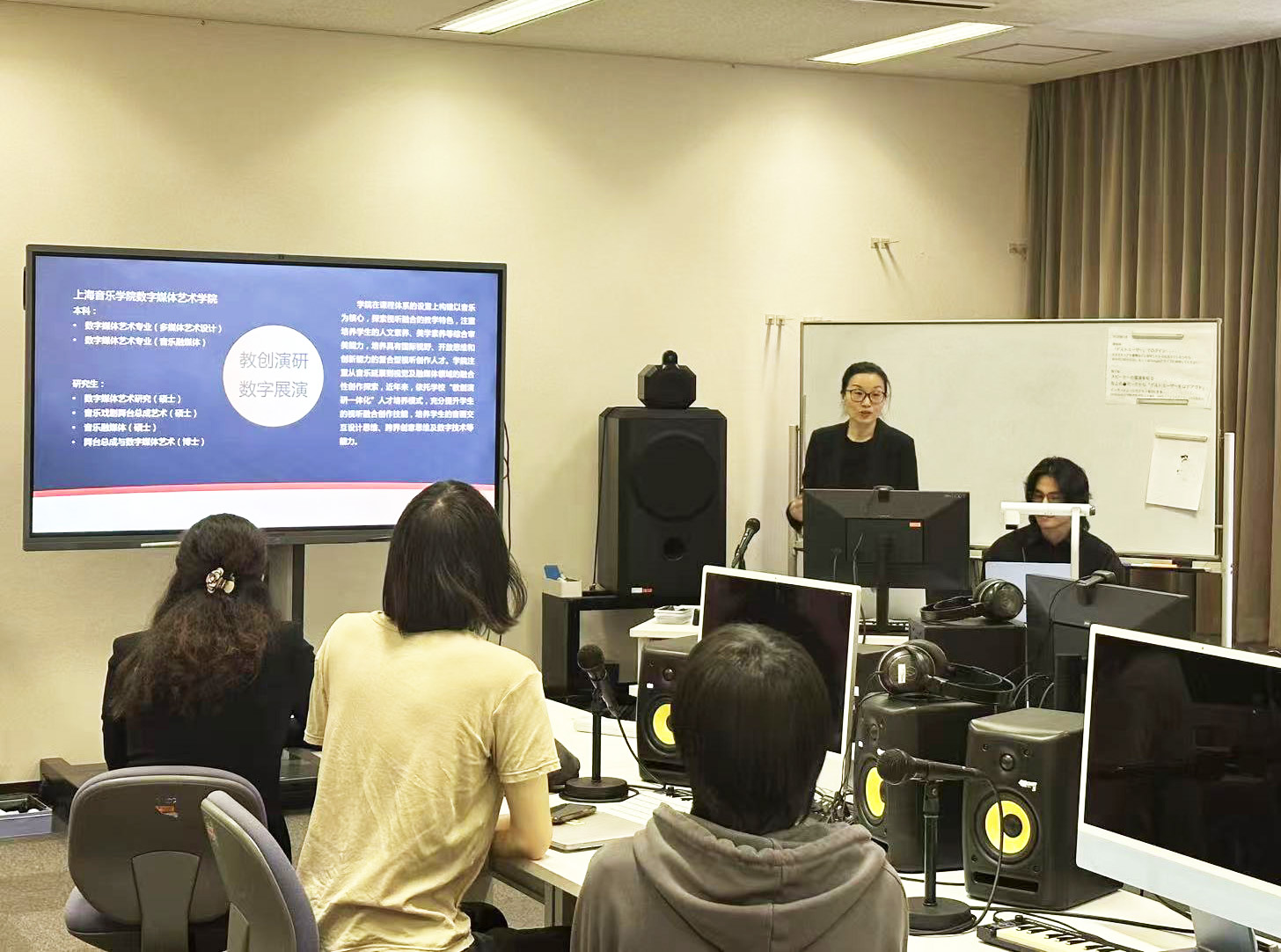 また、午後には本学教授の菊池 幸夫先生(作曲専修)並びに本学准教授の今井 慎太郎先生(コンピュータ音楽専修)の協力の下、陳牧声教授による作曲のマスタークラスと、程瑜懐教授によるデジタルメディアアートの講座が開催されました。