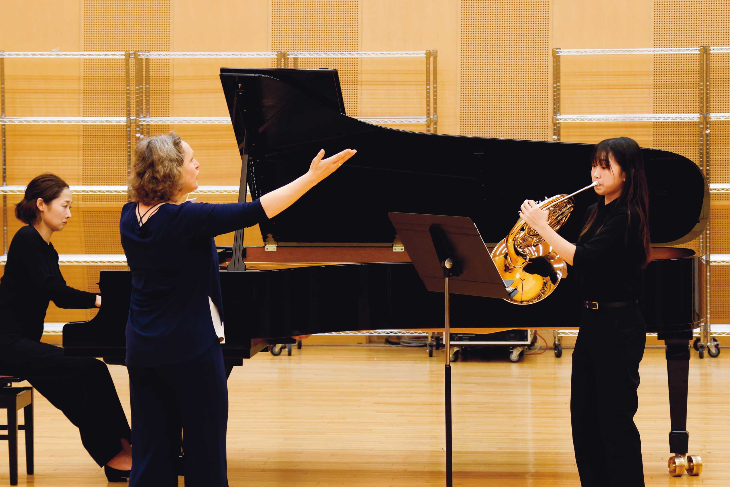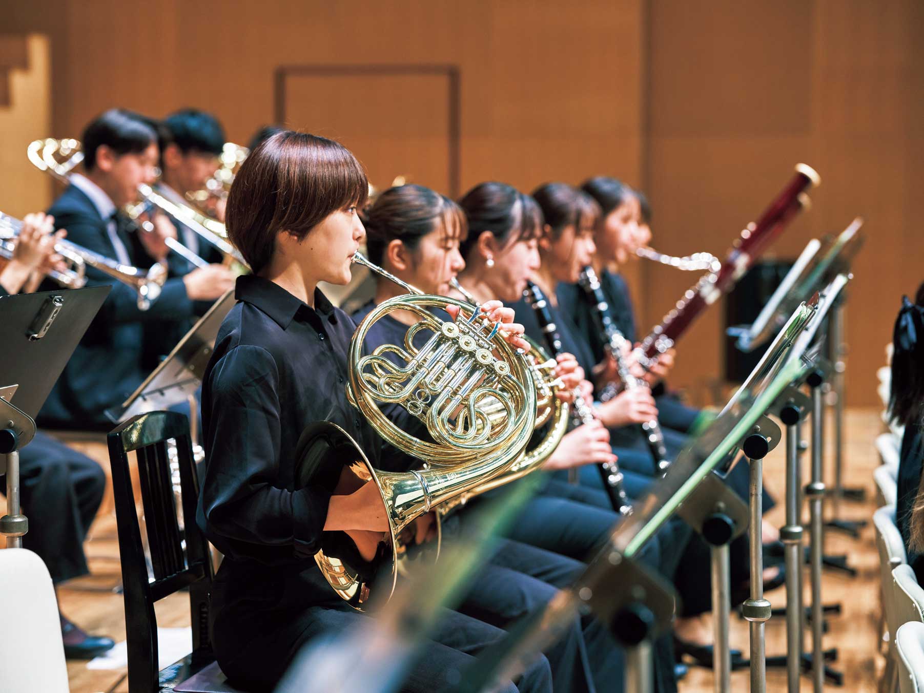 個々の演奏技術の向上を目指しつつ、基礎課程から同属楽器によるアンサンブルをカリキュラムの中心に据え、それを混合編成によるアンサンブルへとつなげていくことで演奏の幅を広げます。さまざまな演奏者とアンサンブルを行うことで、多様な個性を受け入れながら協調性を保つという、音楽の世界のみならず社会で求められるコミュニケーション力を身につけます。演奏の機会や学びを通して、ソリスト、管弦楽、吹奏楽、室内楽奏者にとどまらず、音楽を必要とするあらゆる分野で活躍できる人材を育てます。