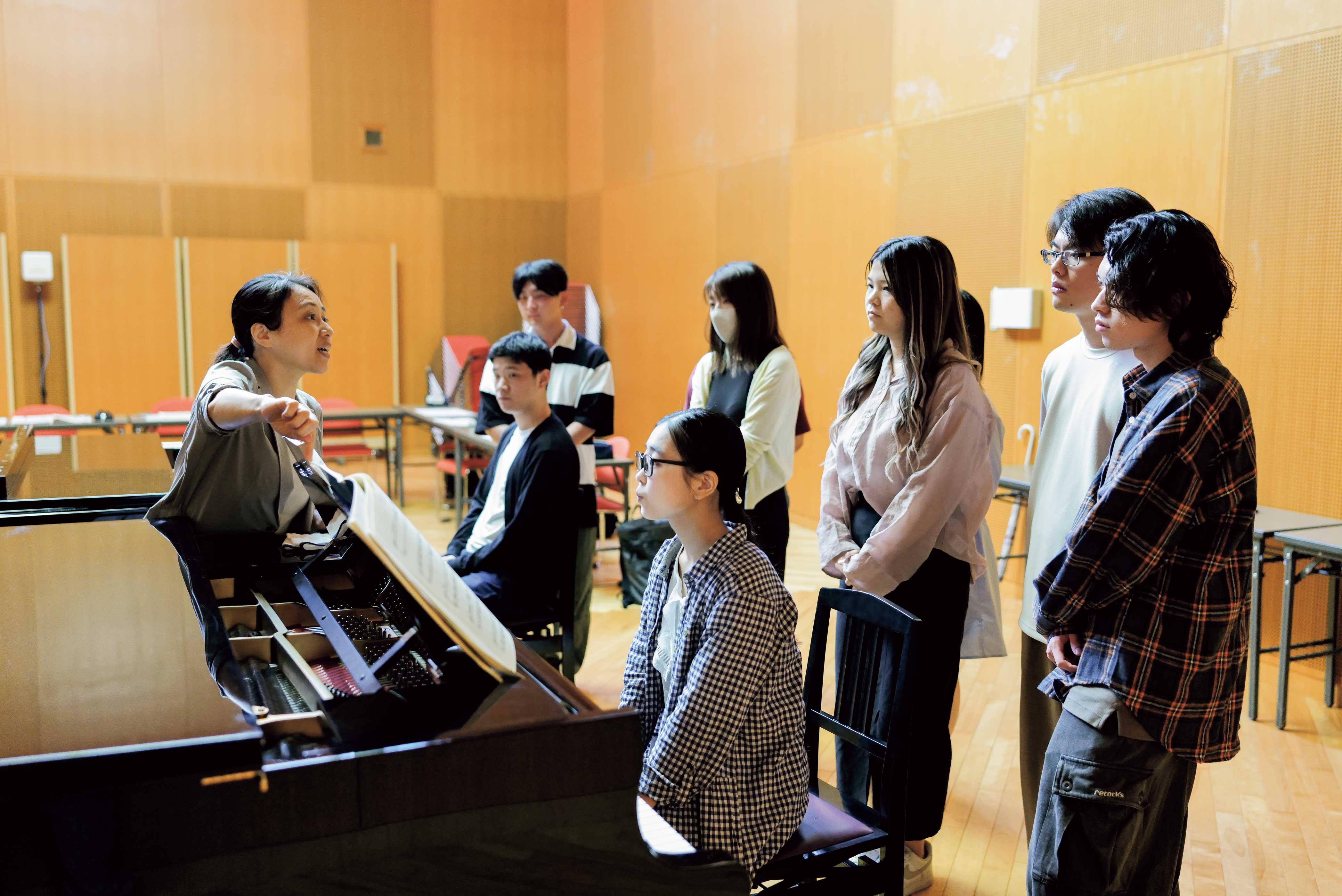 「リズム」「メロディ」「ハーモニー」を一体として学び、楽譜に書かれたものを音にするだけでなく、より音楽的に演奏するための表現力・読譜力を身につけます。1年次では初見・移調奏、連弾などを通して演奏上の基本的な事柄を学び、2年次ではピアノの指導法も研究。授業を通してソロだけでなくアンサンブルや伴奏など多様な演奏機会への対応力が身につきます。