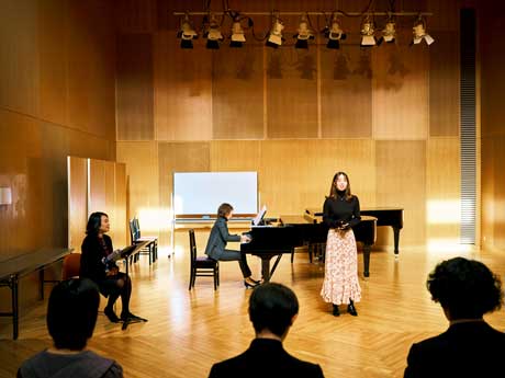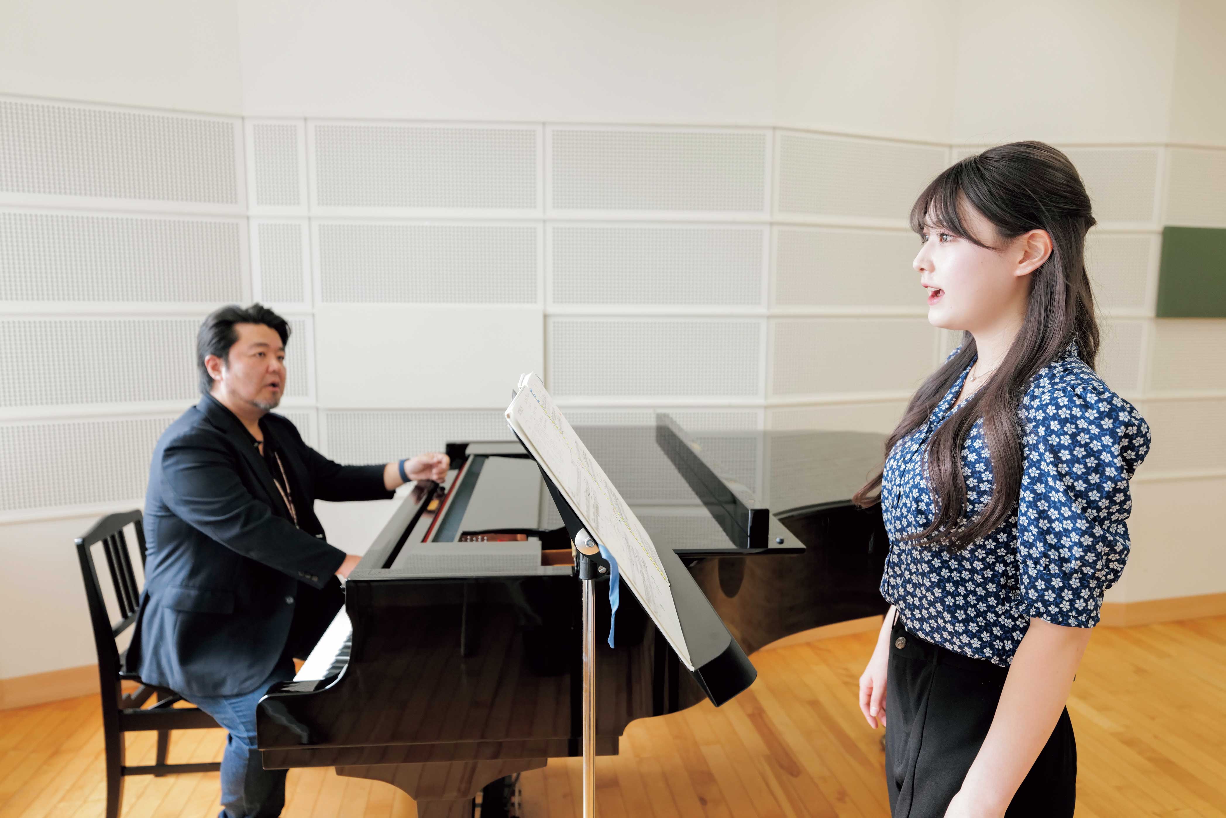 「声」を基礎からつくり、オペラ、歌曲などあらゆるステージに対応できる力を養います。正しい発声を修得すると同時に、作品の成り立ちや背景などへの理解を深め、表現力を磨くことにも重きを置きます。日本語だけでなく、伊・独・仏・英語などの他言語を学び、それぞれの原語に応じた母音や子音の微妙なニュアンスまで意識して、聴き手に感情や情景が深く伝わる歌唱を指導します。3年次からの専門課程では、「歌曲ソリスト・コース」や、「オペラ・ソリスト・コース」(選抜制)をはじめとする、より専門的なコースの選択が可能になるほか、教育者やコレペティートルなどになるための幅広い授業が開講されています。